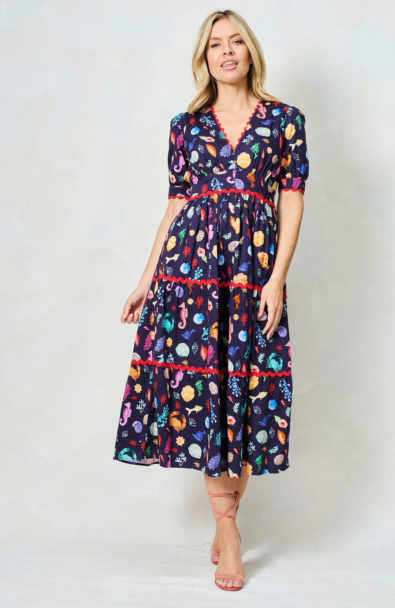 A feminine full-skirted tea dress is perfect for beachside picnics, summer parties and all sorts of seasonal soirées. With a charming, hand-designed print featuring underwater creatives, the 100% cotton Laurel is cut with a flattering V-neck and complete with puff sleeves and a banded skirt. We love the little details, including the rickrack trim and flexible shirred back.