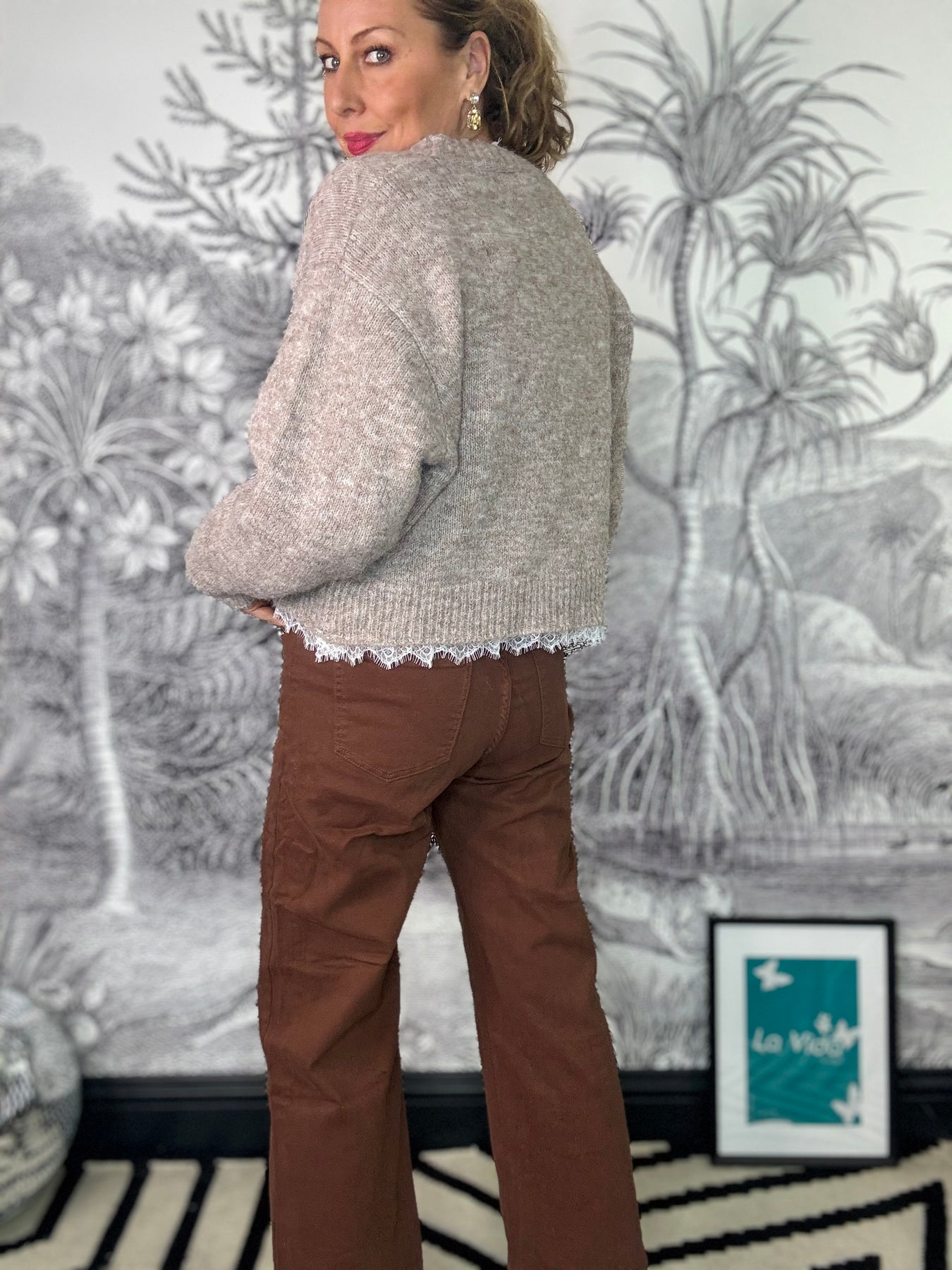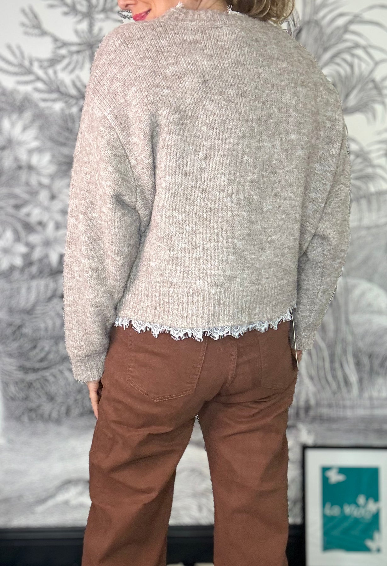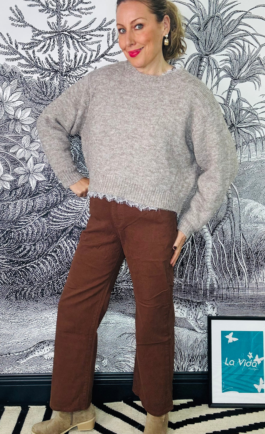 The Raya Lace Trimmed Jumper brings a playful twist to cozy style with its delicate lace accents adding a touch of femininity. Crafted for softness and warmth, this jumper effortlessly balances comfort with charm. Whether layered over your favourite jeans or dressed up for a casual date, its unique lace trim makes it a standout piece in your wardrobe. Embrace cosy days with a dash of flirtatious detail that keeps your look fresh and fun all season long.