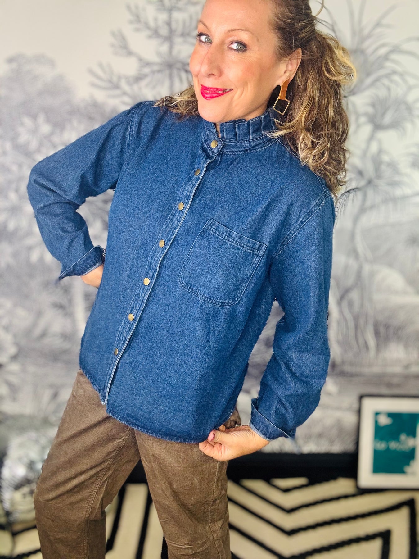 The Gwen Denim Frill Collar Shirt combines timeless denim craftsmanship with elegant design details for a refined look. Featuring a delicately gathered frill collar, this shirt adds a subtle feminine touch to its classic silhouette. Made from premium denim, it offers durability while maintaining softness and comfort throughout the day. Perfect for sophisticated layering or as a standalone statement piece, the tailored fit ensures flattering wear. Elevate your everyday wardrobe with this versatile shirt that balances casual ease and polished style effortlessly.