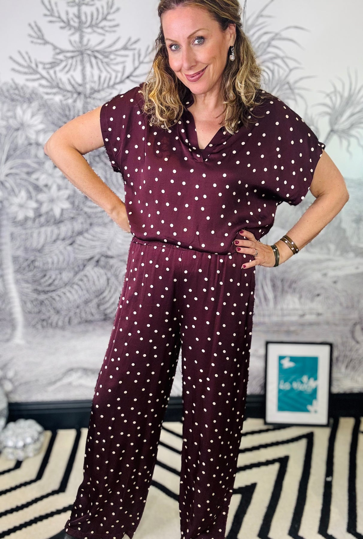 Elevate your wardrobe with the Valery Polka Dot Short Sleeve Blouse in Plum, a refined choice for day-to-night elegance. Crafted from breathable fabric, this blouse features a classic polka dot pattern that adds timeless charm to the rich plum hue. Its tailored short sleeves and subtle drape ensure a flattering fit, making it perfect for both professional settings and casual outings. Pair with tailored trousers or a sleek skirt for a sophisticated look that exudes effortless style. This blouse combines comfort and chic design, elevating any ensemble with understated grace.