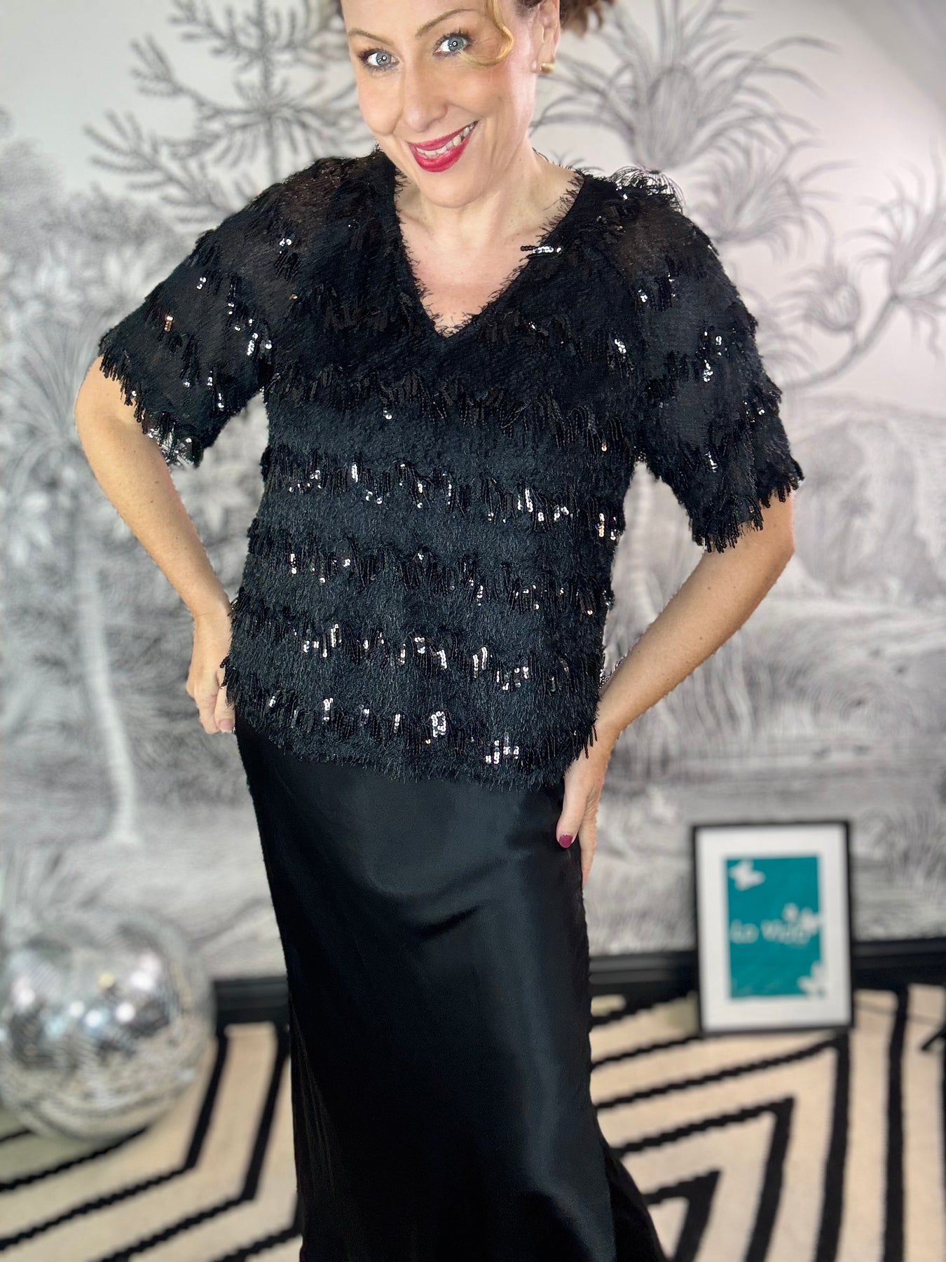 The Fitz Sequin Fringe Top in Black is an understated yet striking essential for the modern wardrobe. This refined piece combines luxurious sequin embellishment with graceful fringe accents, creating texture and visual interest without compromising elegance. The classic black palette ensures effortless versatility—wear it as a standalone statement or layer it beneath structured outerwear for added dimension. Perfect for evening gatherings, cocktail events, or whenever you desire a touch of understated glamour. The sophisticated construction and timeless colour make this a piece you'll return to season after season, pairing beautifully with everything from evening wear to smart-casual separates.