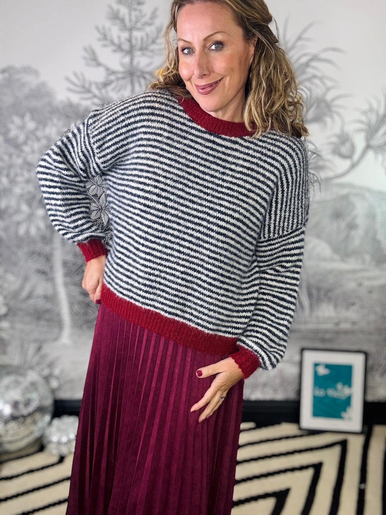 Elevate your wardrobe with the Gigi Striped Knit Jumper, a refined piece that effortlessly blends classic design with contemporary flair. Crafted from soft, breathable fabric, this jumper features elegant stripes that add subtle visual interest without overwhelming your look. Its tailored fit drapes smoothly, providing comfort and sophistication for both casual and polished ensembles. Perfect for layering or as a statement on its own, the Gigi Jumper seamlessly transitions from day to evening, embodying timeless style with understated charm.
