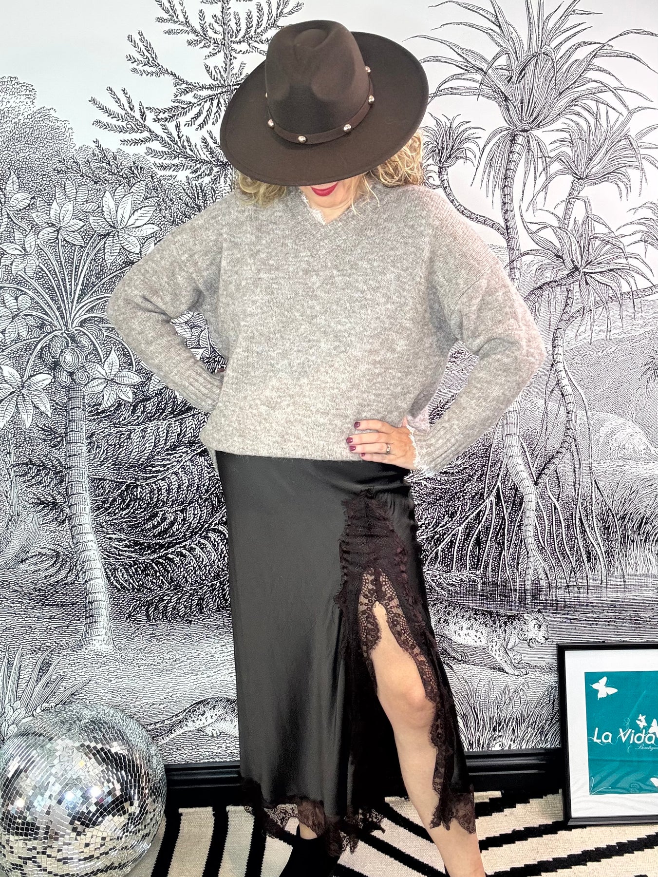 Discover timeless elegance with the Sinclair Satin Skirt, a wardrobe essential that exudes refined sophisication. This exquisite piece features a sumptuous satin fabric that drapes with graceful fluidity, creating an effortlessly chic silhouette suitable for any occasion. The strategically placed split adds an element of modern allure and ease of movement, while intricate lace trim adorning the hem introduces an understated touch of luxury. Perfect for transitioning from boardroom to evening events, the Sinclair pairs beautifully with tailored blazers, delicate blouses, or statement tops. The lustrous satin finish catches light with subtle radiance, ensuring you maintain an air of understated glamour throughout your day.