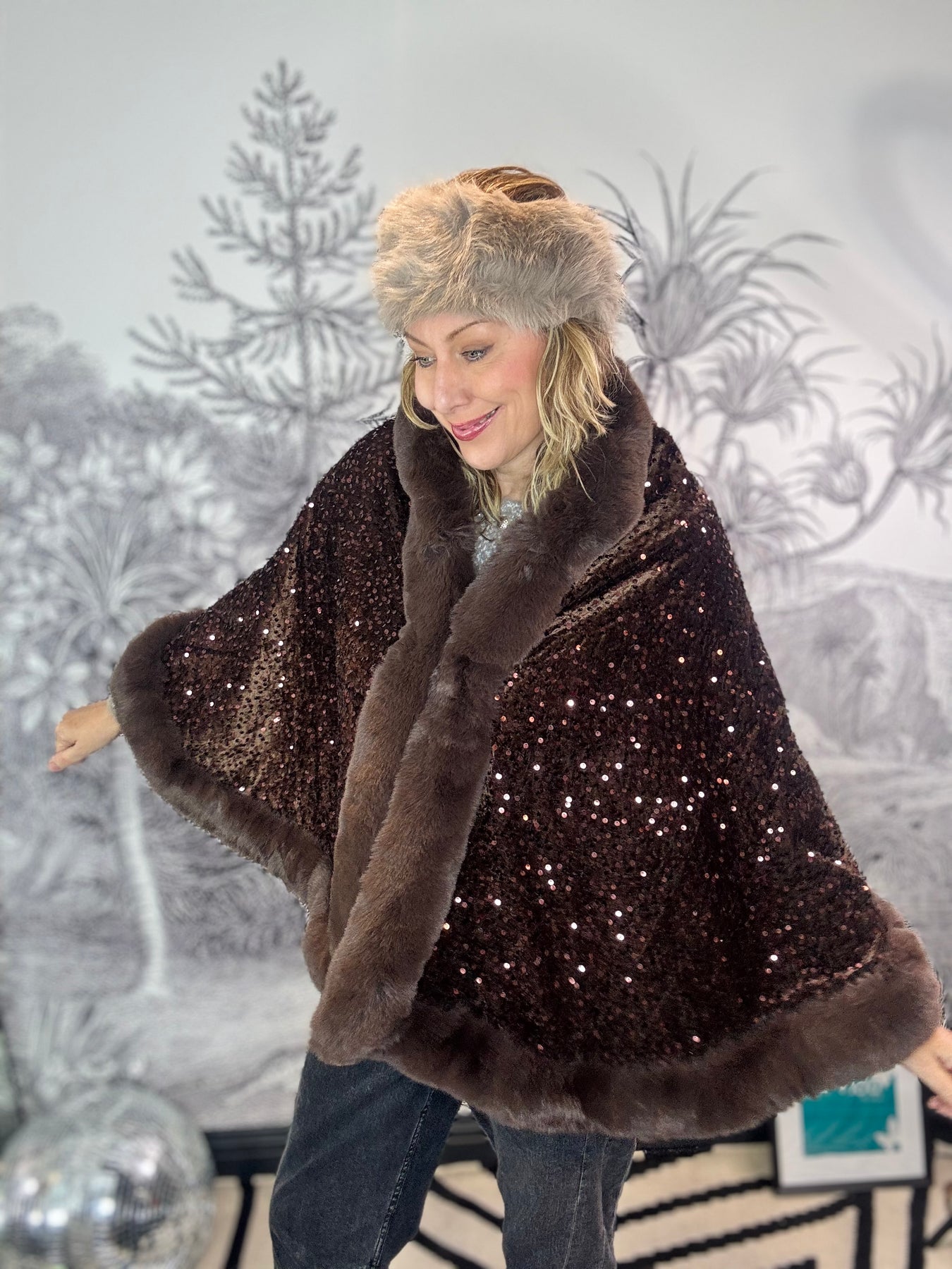 Elevate your evening ensemble with this stunning Saran Sequin Cape, a timeless piece that seamlessly blends glamour with refined elegance. Crafted from shimmering sequin fabric, this cape catches the light beautifully, creating a mesmerizing sparkle with every movement. The luxurious plush trim frames the silhouette with a soft, tactile contrast that adds depth and sophistication to your look. Perfect for special occasions, formal events, or when you simply wish to make a memorable entrance, this cape drapes gracefully over your shoulders, offering both style and comfort. Whether layered over an evening gown or paired with tailored separates, it's the ultimate statement piece for those who appreciate understated luxury and distinctive flair.