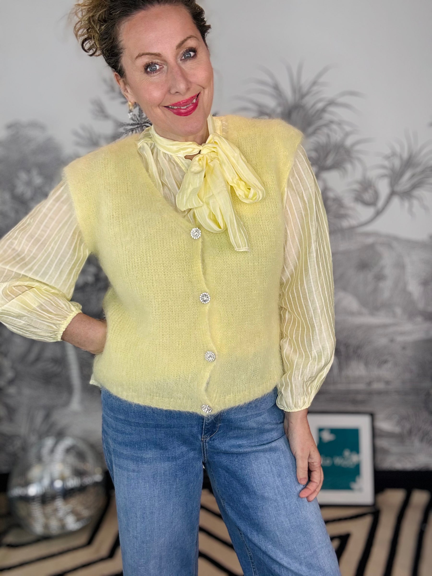 Meet the Bjoerk—your new favourite layering essential. This lightweight mohair vest combines understated sophistication with just the right amount of sparkle, thanks to its stunning diamante button closures. The flattering V-neck and sleek sleeveless design make it endlessly versatile, whether you're styling it over a crisp shirt, delicate blouse, or favourite dress. The airy, soft construction feels as good as it looks. Pro tip: treat this beauty with care by airing it out between wears and hand washing gently in cold water when needed. A quick steam will have it looking fresh and fabulous every time.