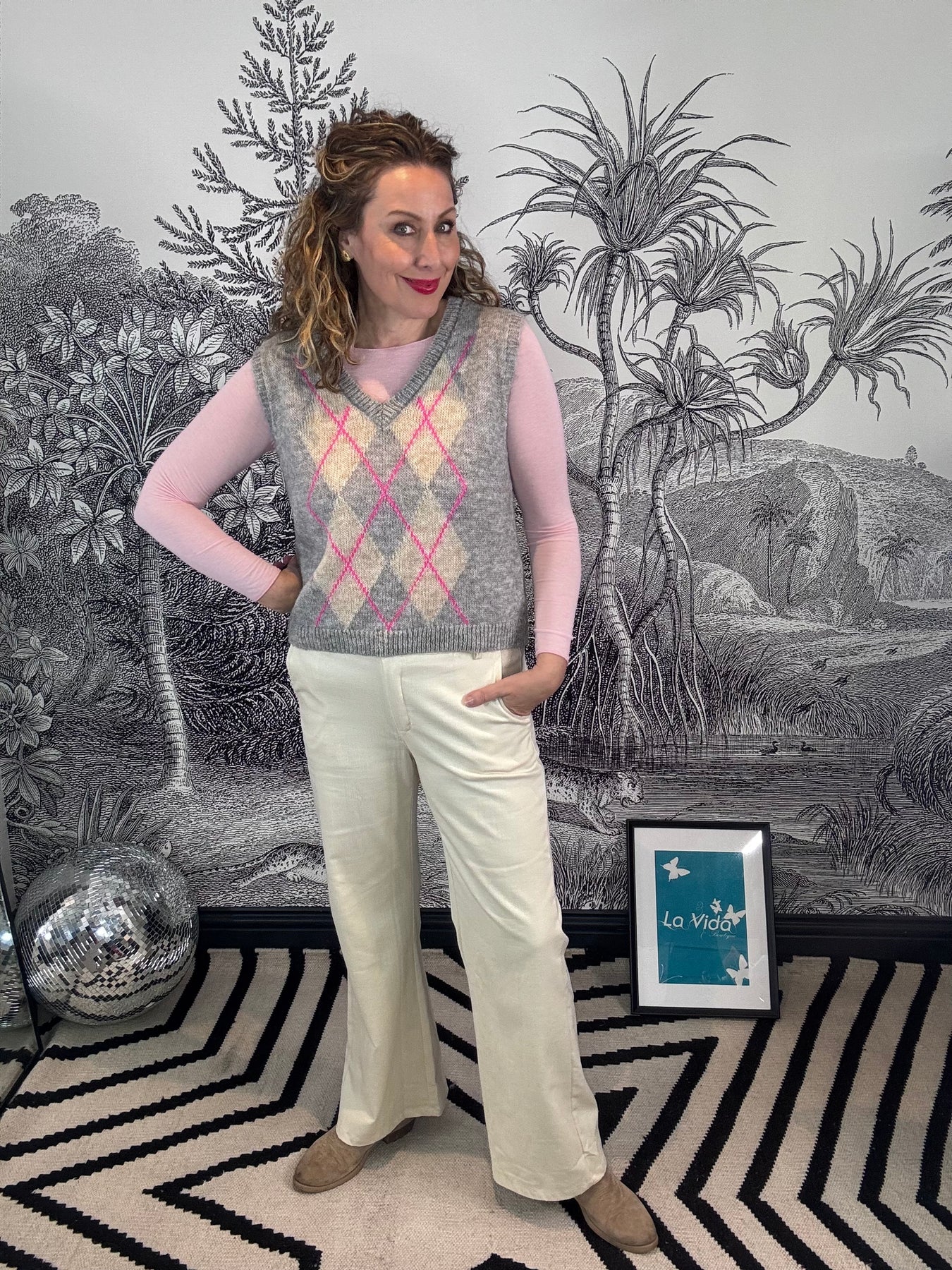 Meet the Emily V Neck Argyle Pattern Mohair Tank Top—a stunning Italian-crafted essential that's about to become your go-to layering hero. The luxurious mohair fabric drapes beautifully, while the timeless argyle pattern and flattering V neckline add understated sophistication. Wear it solo for effortless elegance or layer it over a crisp white tee as you transition into spring. Versatile, tactile, and undeniably chic, this tank top is the kind of piece that works harder than it looks.