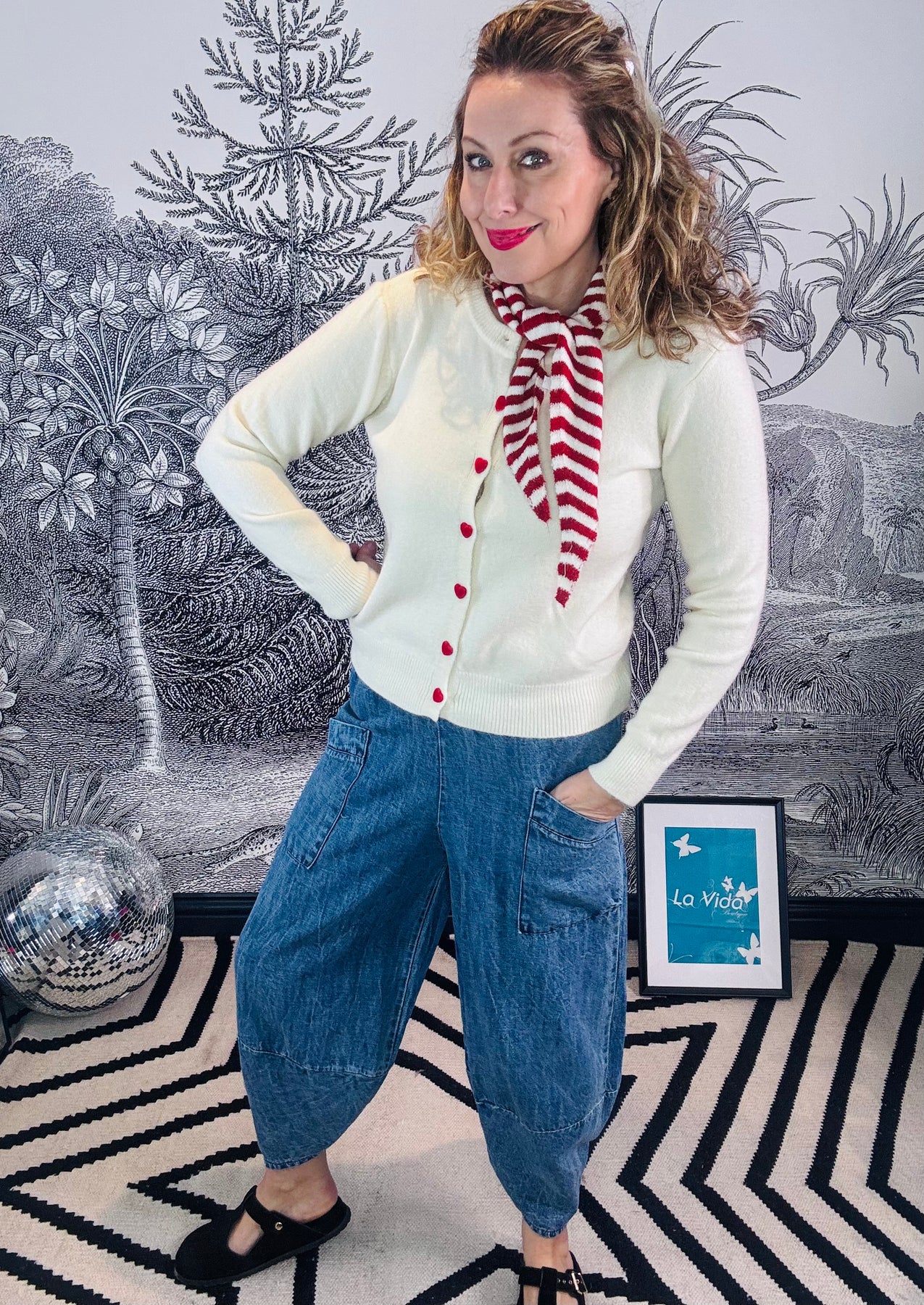 Introducing the Ramona Heart Button Cardigan, a timeless layering piece that effortlessly elevates any wardrobe. Crafted with meticulous attention to detail, this cardigan features delicate heart-shaped buttons that add a touch of romantic charm without compromising on sophistication. The relaxed fit ensures comfort throughout the day, while the refined silhouette works beautifully over dresses, blouses, or worn open as a statement layer. Perfect for transitional seasons, this versatile piece transitions seamlessly from casual daywear to polished evening looks. An investment in understated elegance that will become a cherished staple in your collection.