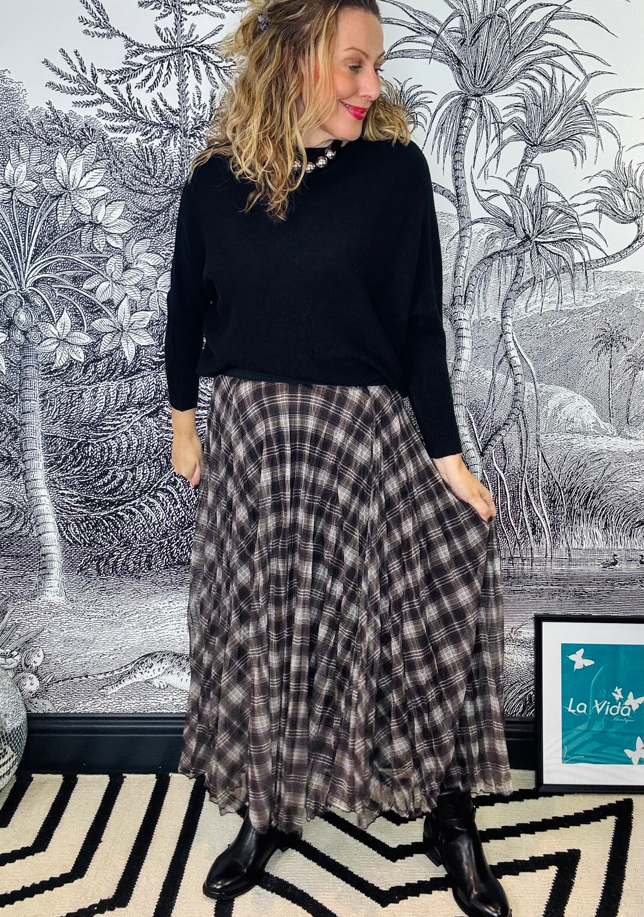 The Tiva Tartan Midi Skirt in Grey Mix combines timeless tartan elegance with a contemporary midi length for a sophisticated look. Designed to flatter and crafted from quality fabric, its subtle grey tones add versatility, making it perfect for both refined office wear and stylish weekend outings. This skirt effortlessly enhances your wardrobe with classic charm and modern grace, ensuring you stand out with understated sophistication.
