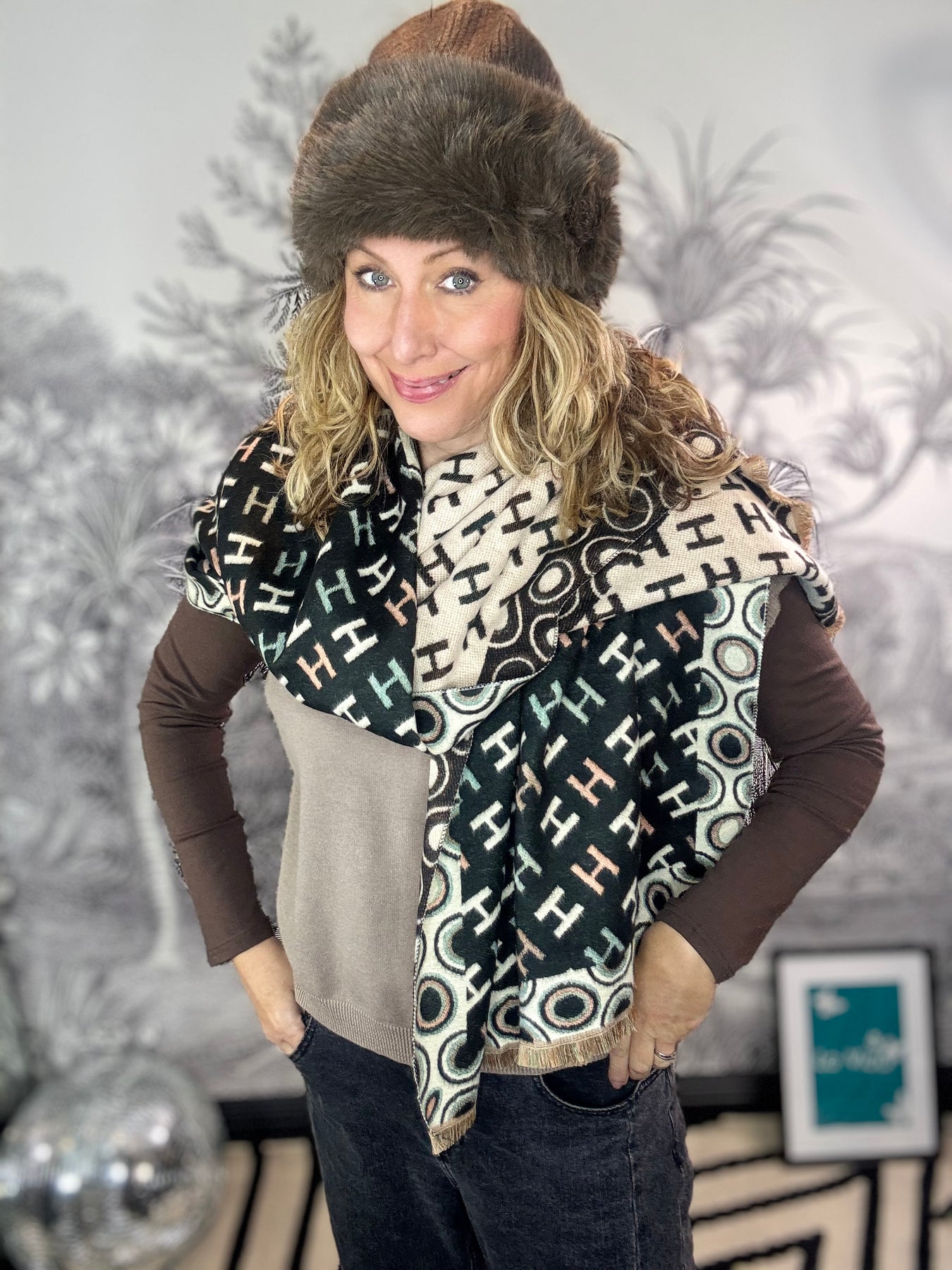 Elevate your winter wardrobe with this refined monogrammed scarf, featuring a timeless black and beige palette that effortlessly complements any ensemble. The distinctive H monogram adds a touch of personal elegance, making it an ideal choice for those who appreciate understated luxury. Crafted for both warmth and style, this versatile accessory transitions seamlessly from casual outings to sophisticated occasions. The neutral colour combination ensures it pairs beautifully with your existing pieces, while the quality construction promises lasting wear through the season. A perfect investment for the discerning individual seeking to add a signature piece to their collection.