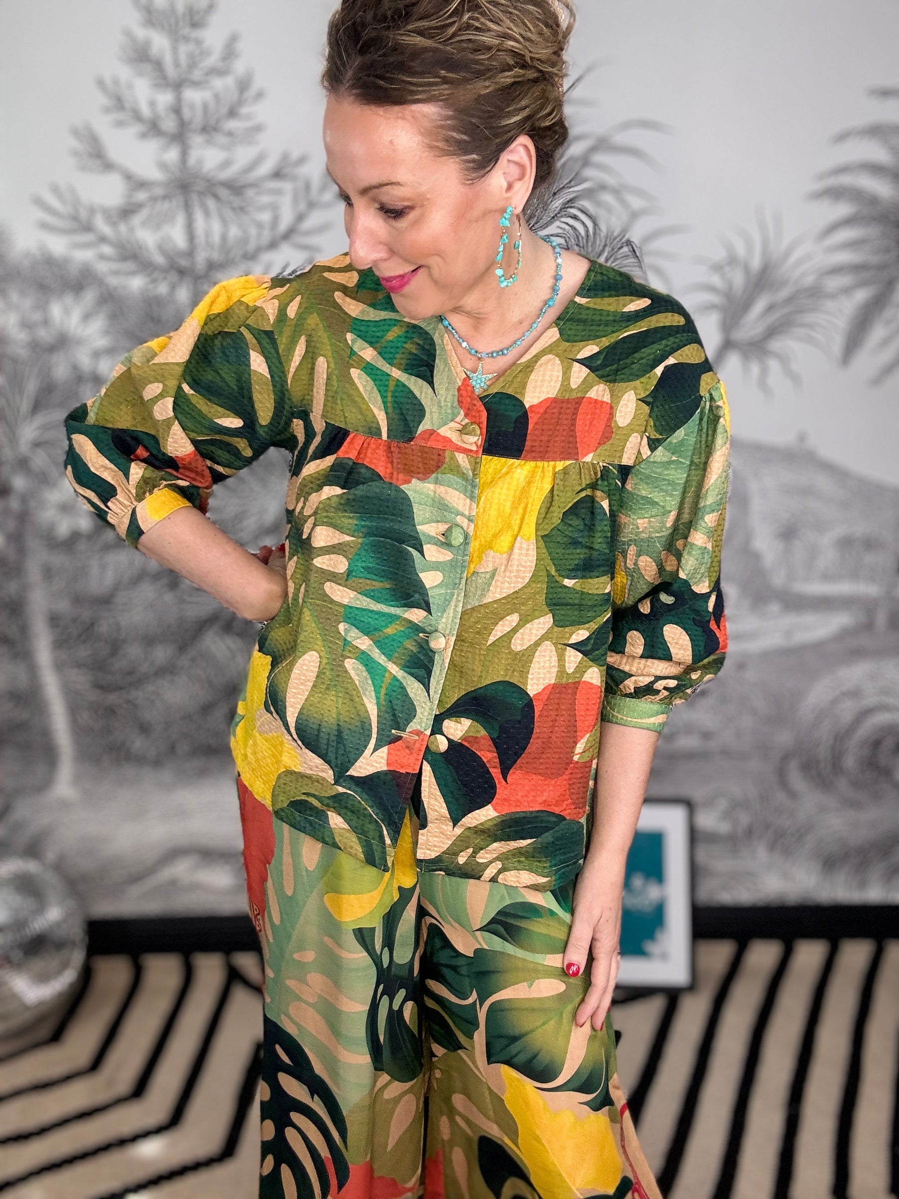 Exotic Leaves Short Cotton Jacket Striking rainforest-inspired design featuring vibrant, intertwining leaf patterns in sunny and partially shaded tones. Crafted from 100% cotton, this timeless and feminine jacket is perfect for art and travel lovers seeking versatile style. Pair with jeans and a top for an elevated day look, or style with a skirt for a luxurious evening ensemble. One size fits all. Care: Cool hand wash only. Iron on low heat.