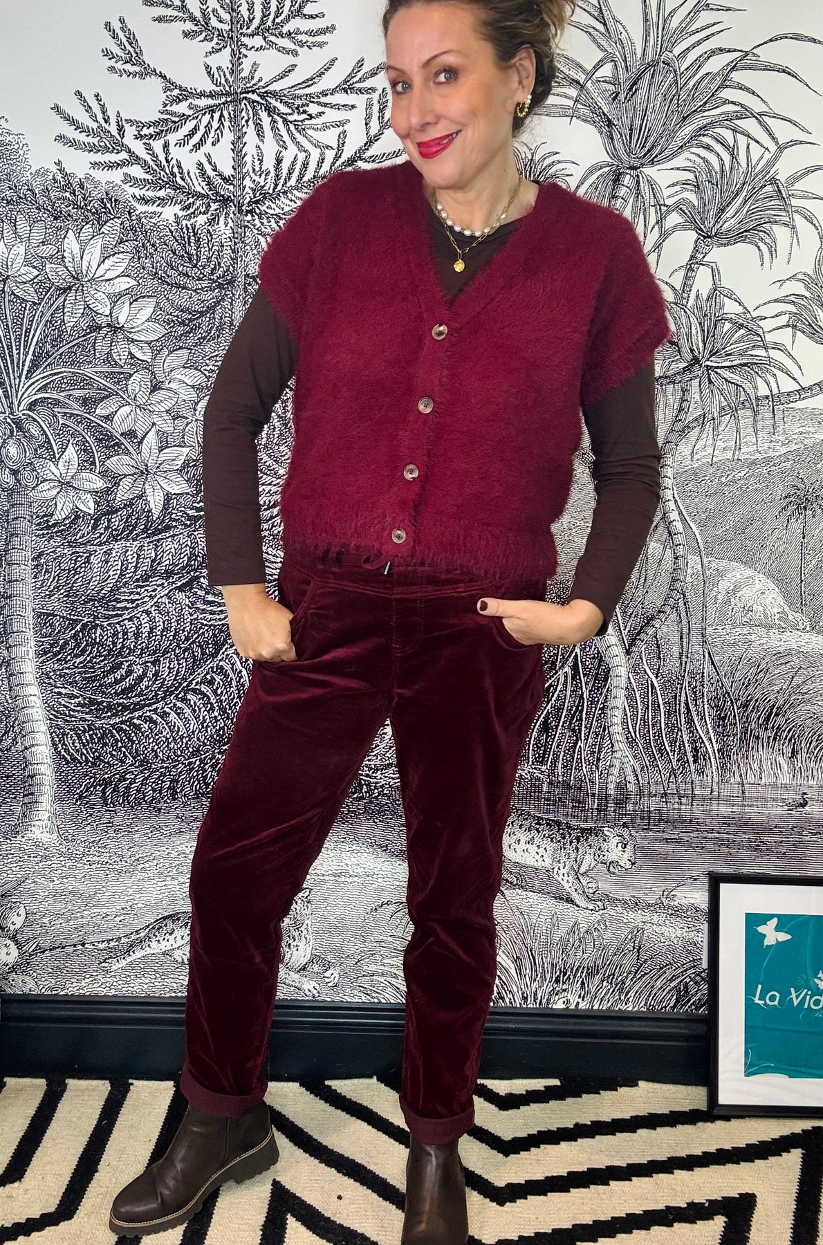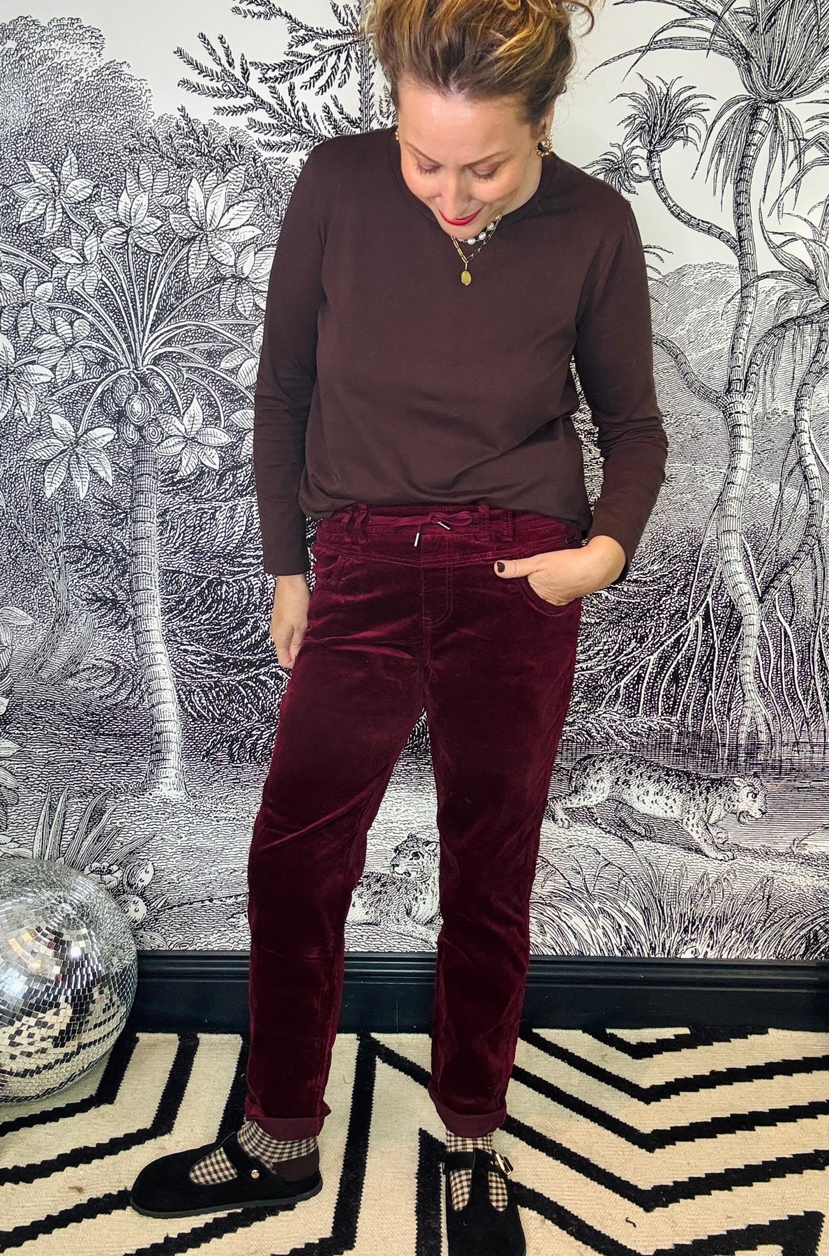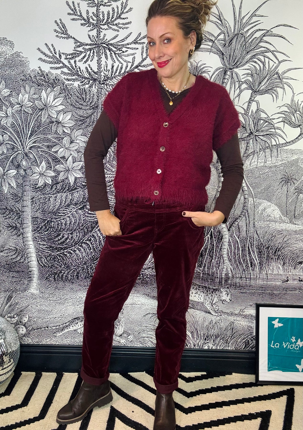 Step into bold comfort with the Tessy Velvet Jeans in Ruby. These jeans bring a playful twist to your wardrobe with their soft velvet texture and striking grey hue that shifts with the light, giving you a unique look every time. Designed for both style and ease, they offer a flattering fit that moves with you, perfect for dancing through your day or lounging in luxe comfort. Whether paired with a casual tee or a chic blouse, these jeans turn everyday moments into opportunities to shine. Let your outfit spark joy with a touch of velvet charm!