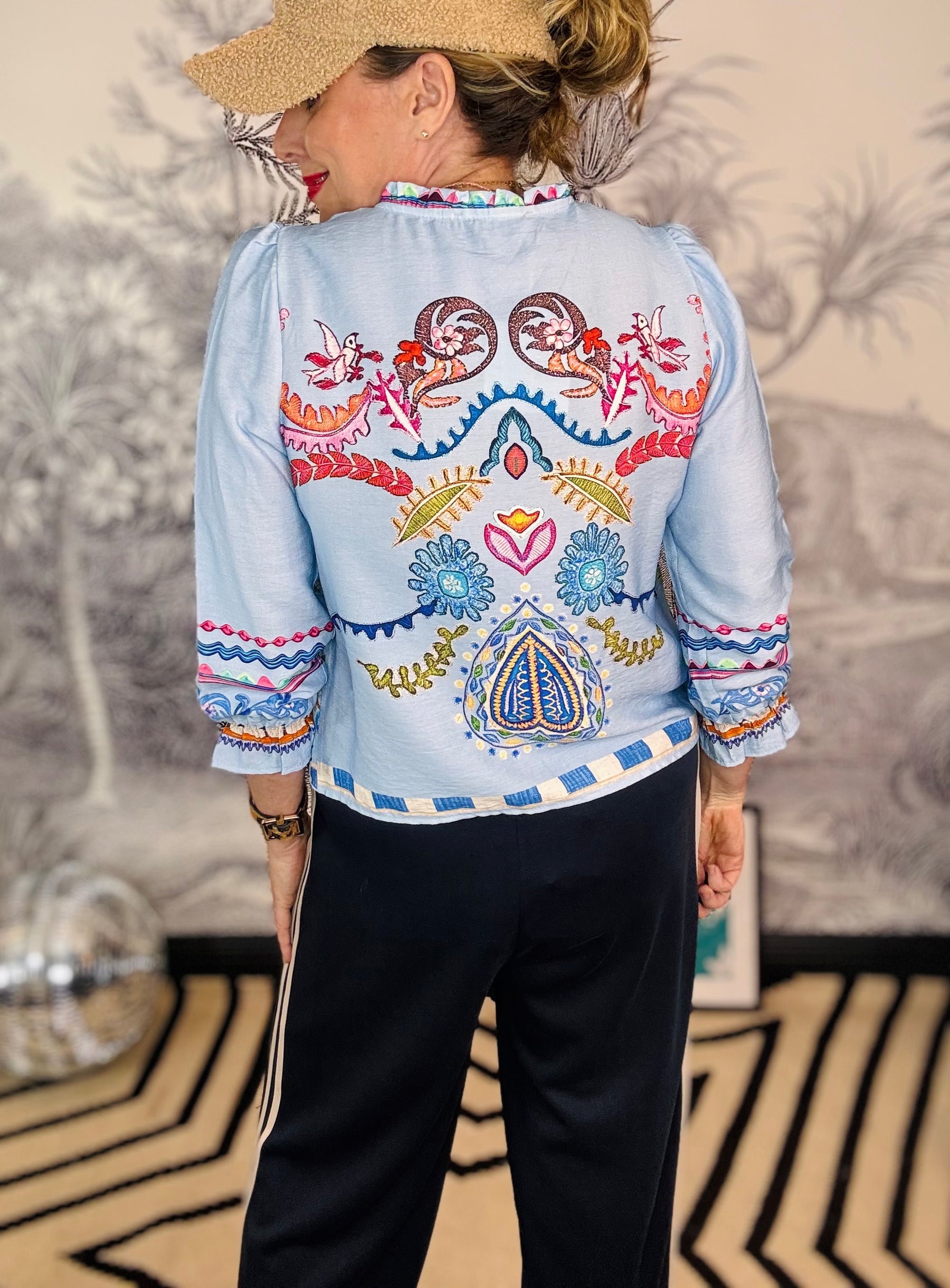 Embrace effortless bohemian style with this charming tie-front blouse. Crafted from lovely crepe fabric, it features a striking folk floral patchwork print that captures free-spirited elegance. The adjustable tie front creates a flattering silhouette, while delicate ruffle trim adorns the neckline and cuffs for added texture and movement. Elasticated cuffs ensure a comfortable fit throughout the day. Perfect for layering or wearing solo, this versatile piece brings boho-chic flair to any wardrobe.